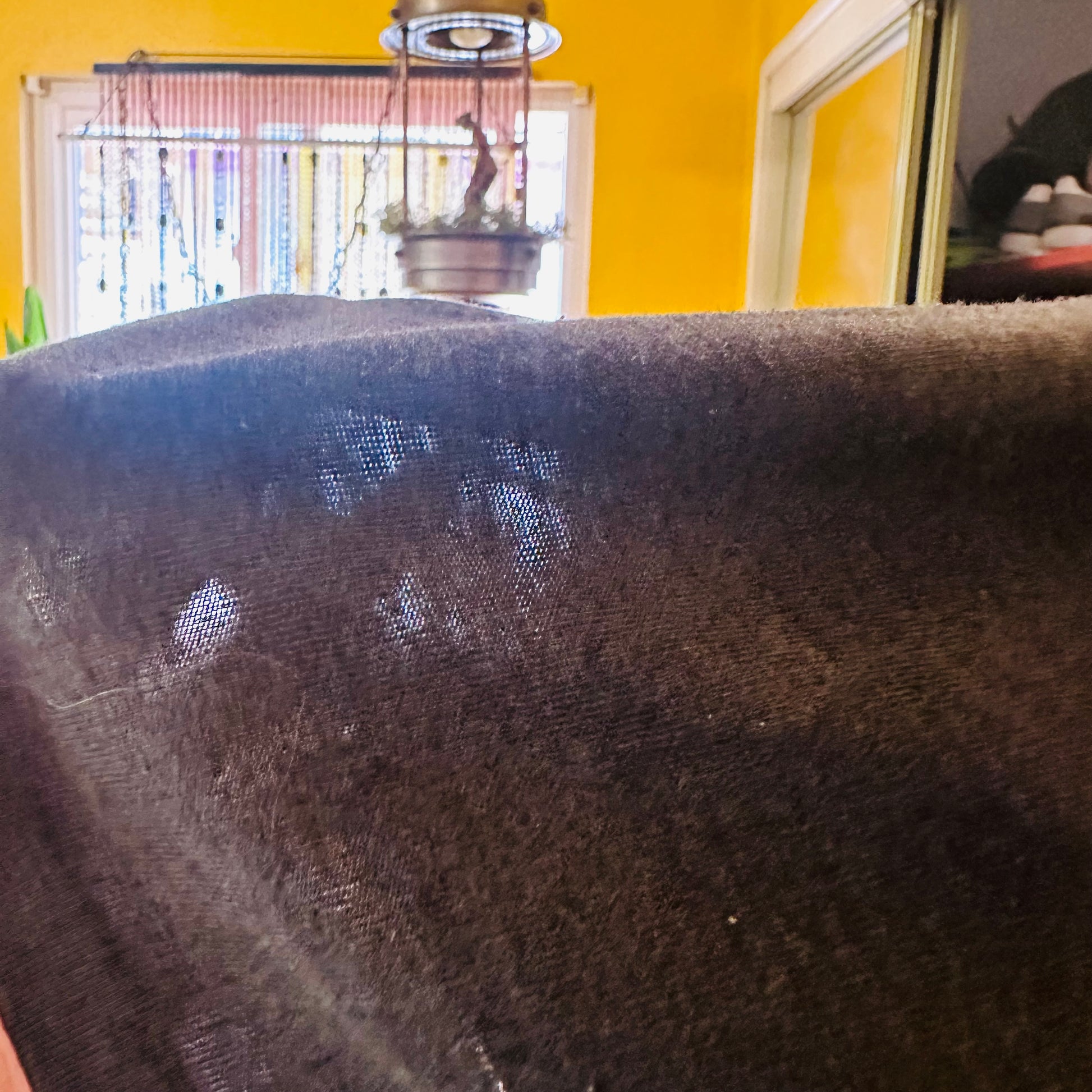 Super soft and thin . Very minimal flaws , has one discoloration at the neck that is pictured. Fits like a Women's Medium . Has stretch .